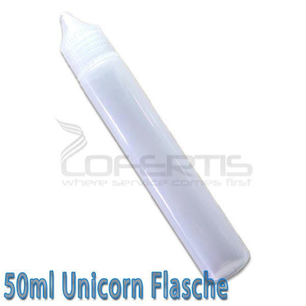 Eine leere 50ml Unicorn eLiquid-Tropfenflasche.
